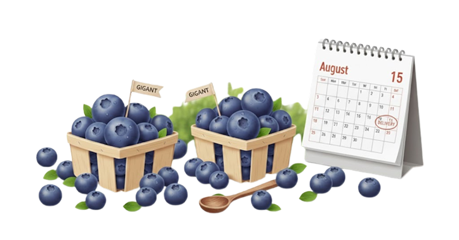 «Blue Giant» — современный высокоурожайный сорт голубики родом из Австралии. Обладает очень крупными, плотными и сладкими ягодами. Ягоды ароматные, с приятным балансом сладости и лёгкой кислинки. Отлично хранятся и хорошо переносят транспортировку.